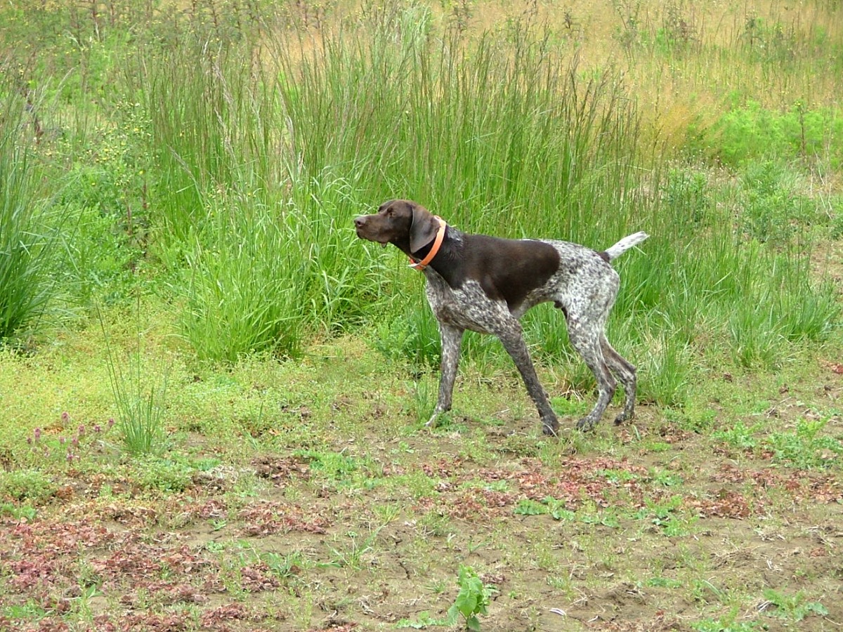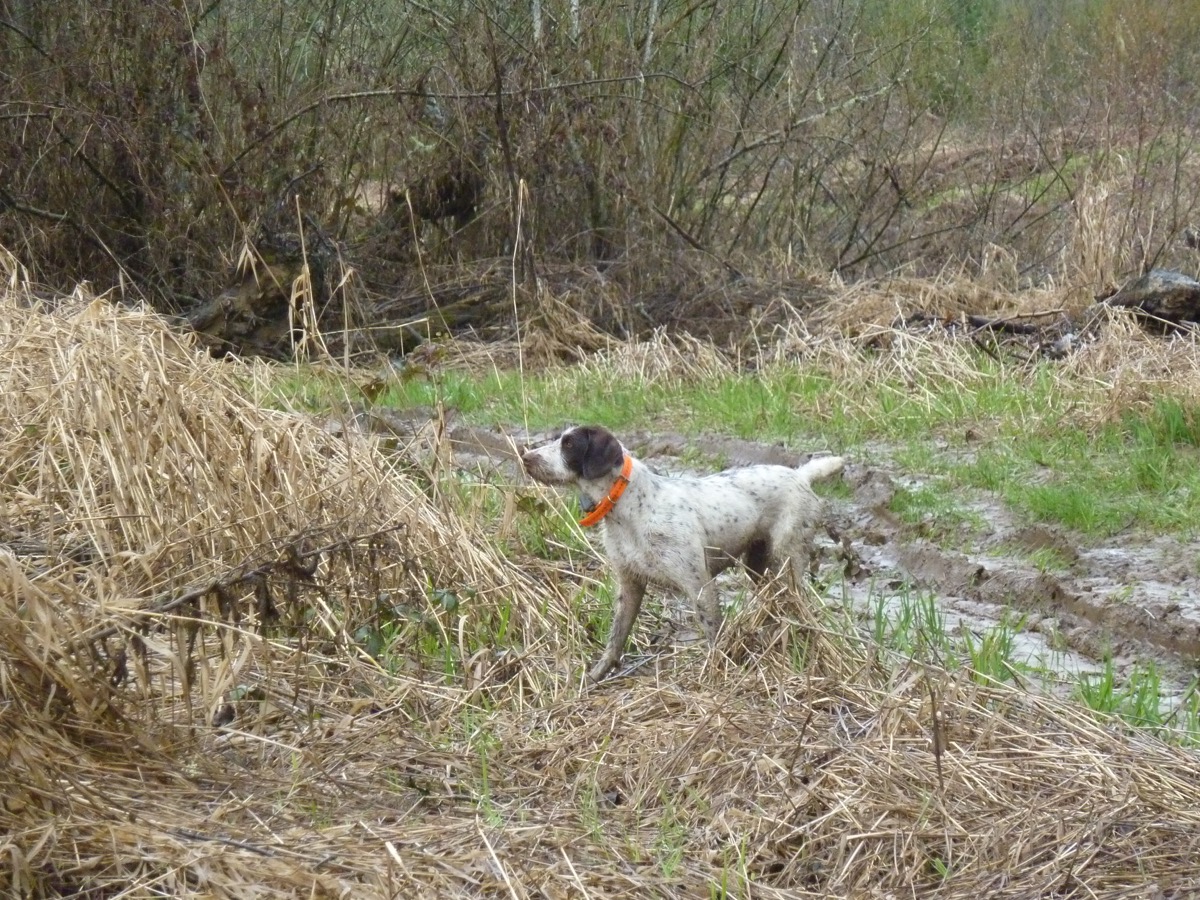 Although the smaller flushing dogs handle the heavy cover extremely well, many of our clients might prefer a pointing breed. To that end, we have KC a German Shorthair bred by Howard Meyer of Chippewa Kennels (www.chippewa-gsp.com). KC is owned and handled by Kendall and is an extremely reliable hunter and an excellent tracker. Kendall also handles Windy, Georgie and Lizzy also shorthairs from Howard’s kennel. Kendall also trains his dogs as hunting companions, and asks only that they find point hold and retrieve. They do that with verve. We have also arranged with other handlers in the local area for pointing dogs. Most of them are Shorthairs, Pudel Pointers or Brittany’s. Occasionally Kendall’s son Nick will handle his Wire Haired Pointing Griffon, Gunther.